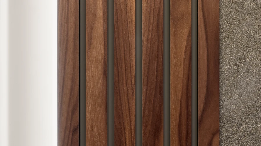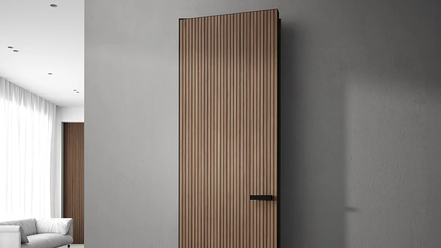 Реечные двери Baffle являются главным трендом в современном интерьере. Могут быть дополнены стеновыми панелями с продолжением фрезировки.