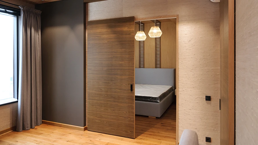 Magic - это современные раздвежные двери с невидимым механизмом. Направляющая рельса и нижний ролик врезаются прямо в дверное полотно, что делает их невидимыми и создаёт эффект мистического полёта двери.